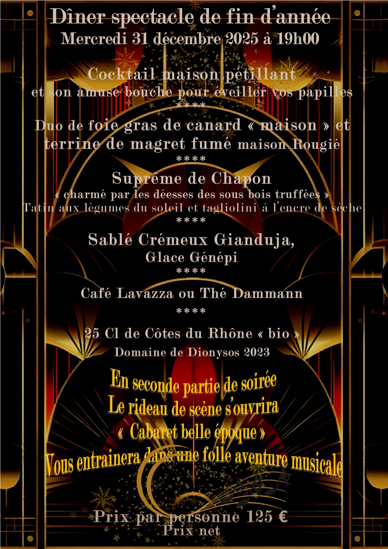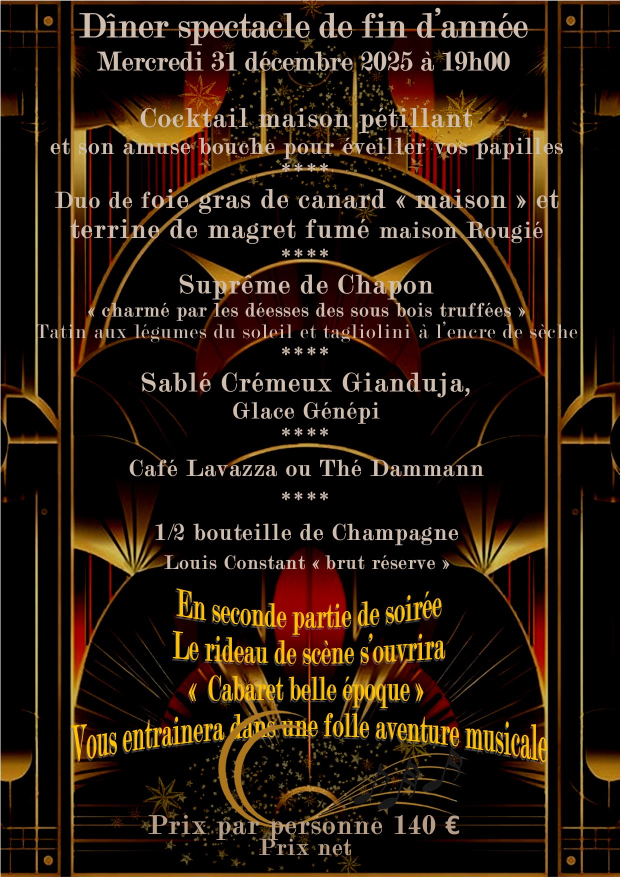 La nuit du réveillon s’ouvre comme un écrin précieux, où chaque instant devient une promesse d’émerveillement. En salle, Marie et son équipe vous accueillent avec grâce et attention, tandis qu’en cuisine, Thierry et sa brigade composent un menu comme une partition gourmande : foie gras maison, chapon, sauce aux cèpes truffés, sablé Gianduja et glace au Génépi… des saveurs qui dialoguent avec l’esprit de fête.